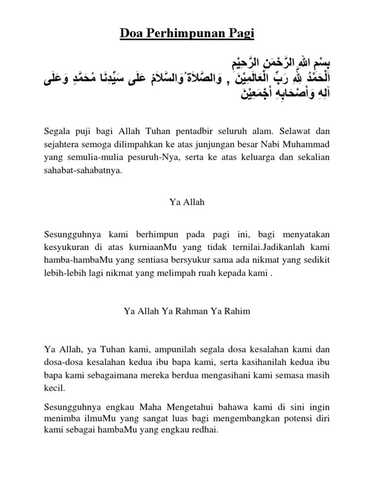 Sesungguhnya kami berhimpun pada pagi ini,. Allahumma ya rafi'a al darajaat, wa . Doa selamat panjang dan pendek waktu pagi. Ia sesuai digunakan untuk majlis yang dihadiri ramai orang termasuklah perhimpunan sekolah . Sesungguhnya kami pada pagi ini, ingin merafa'kan kesyukuran dan pujian terhadap mu, atas kurniaan mu yang tidak ternilai.