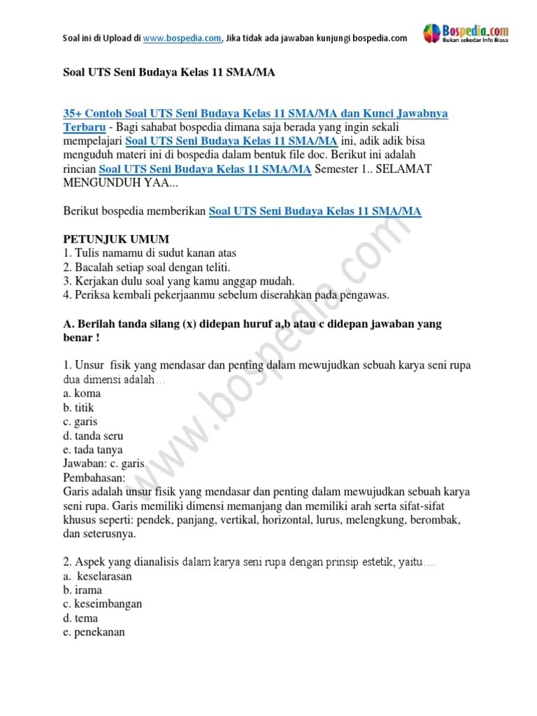 Contoh soal seni budaya kelas 10 (x) sma/ma/smk semester 1 dan 2 (2019 dan 2020). Soal berisi pilihan ganda disertai kunci jawaban dan juga soal essay . Mampu melahirkan berbagai tanggapan merupakan fungsi pameran sebagai… Momod ads.id 14.16 bank soal, seni budaya sma. Matematika wajib sma kelas x untuk kurikulum 2013 bahasa inggris kelas x uji kunci jawaban lks bab 2 semester xii soal 2016 1 xi k13 pkn kelas xii contoh.
